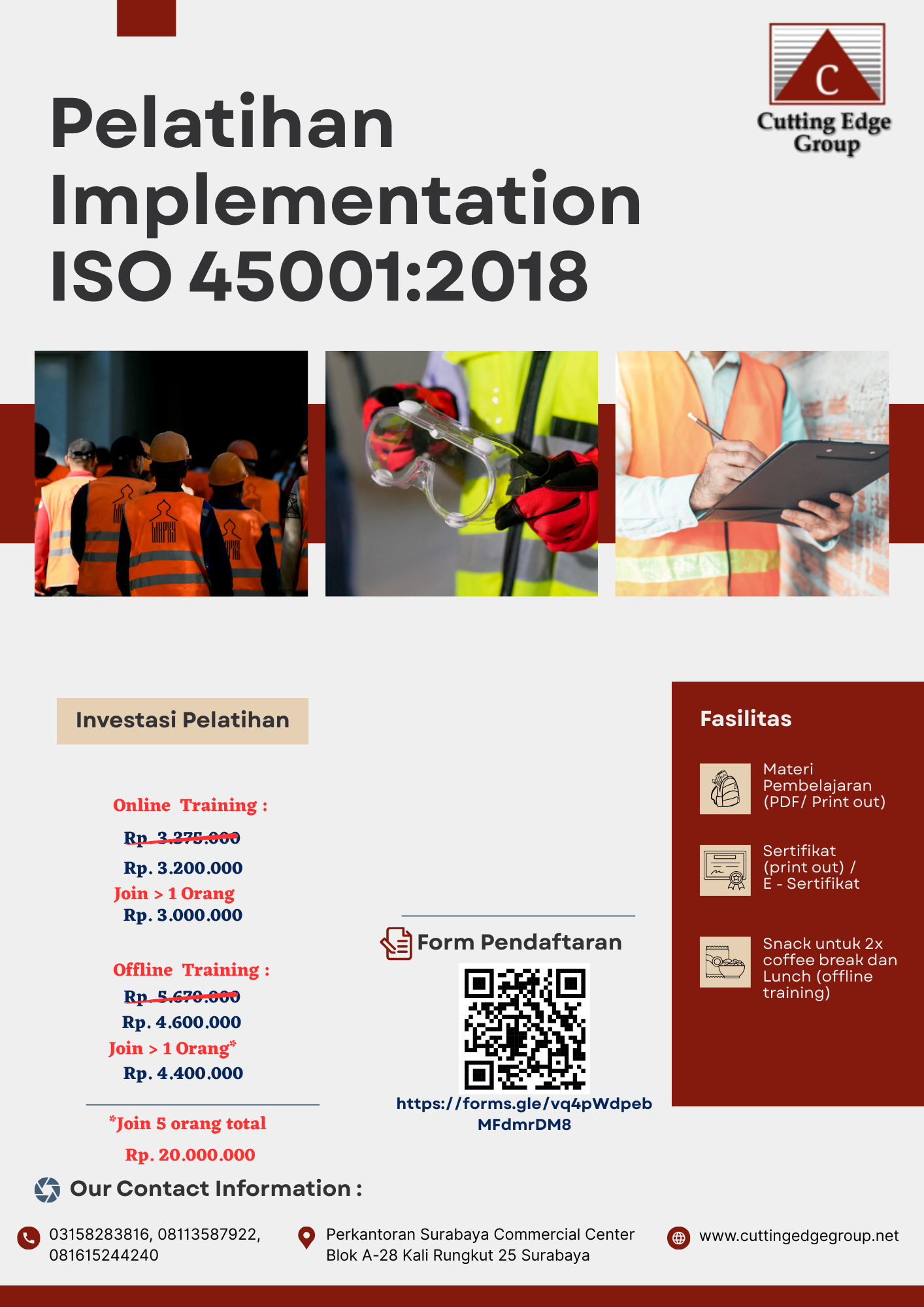 ISO 45001:2018 Implementation menekankan pada proses perencanaan, penerapan, pengendalian, hingga evaluasi kinerja sistem manajemen K3 secara menyeluruh. Dengan implementasi yang tepat, perusahaan mampu mengidentifikasi bahaya, mengendalikan risiko, meningkatkan kepatuhan terhadap regulasi, serta membangun budaya keselamatan kerja yang berkelanjutan.